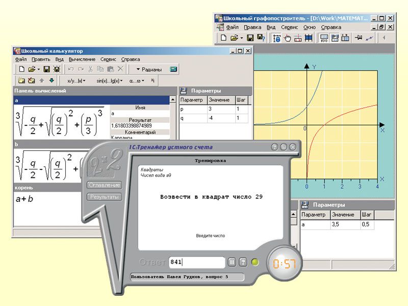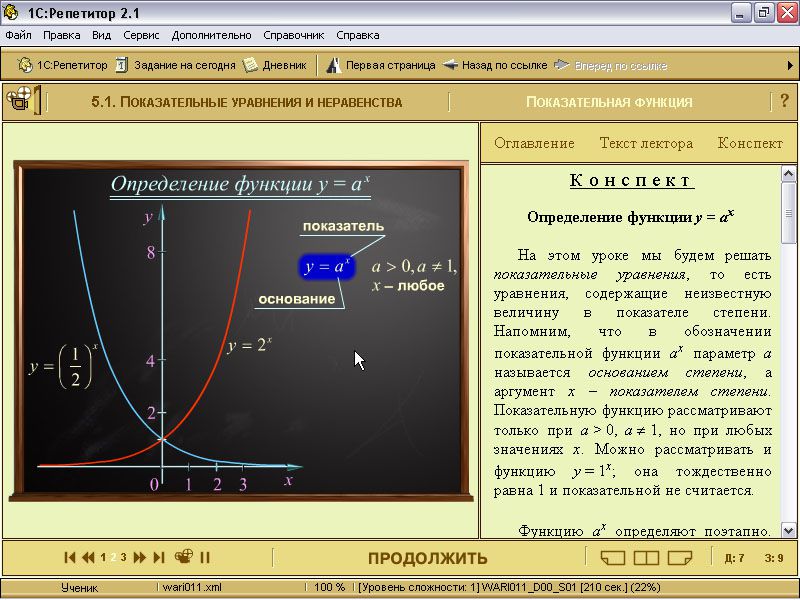 1. «1С:Репетитор. Математика (часть 1)» - мультимедийная обучающая программа, адресованная учащимся старших классов и абитуриентам для самостоятельной подготовки и работы под руководством учителя, а также преподавателям для подготовки и проведения занятий по разделам: алгебра (рациональные, иррациональные, показательные, логарифмические уравнения и неравенства; прогрессии), планиметрия, элементы математического анализа.