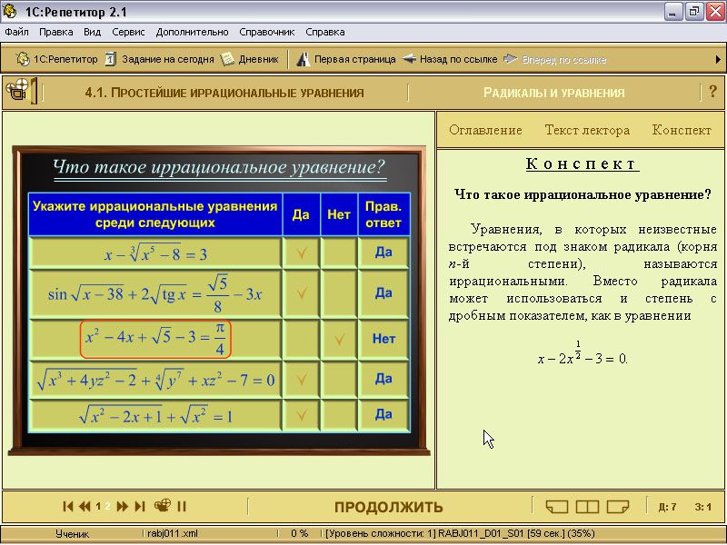 Материал излагается в форме аудиовизуальных интерактивных демонстраций и продублирован в гипертекстовом виде. «1С:Репетитор. Математика (часть 1)» включает в себя 74 урока трех уровней сложности, 375 мультимедийных лекций, 1137 интерактивных заданий. Руководитель авторского коллектива - В.Н. Дубровский.
