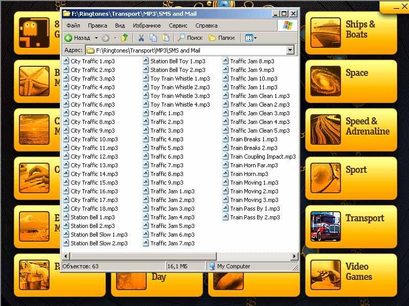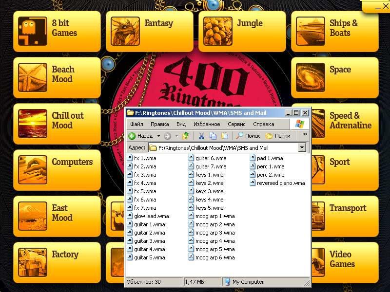 Вы наверняка подберете массу рингтонов по своему вкусу и сможете регулярно менять мелодию звонка под настроение. Каждый день у вас может быть новый яркий рингтон, обращающий на себя внимание ваших знакомых и подчеркивающий вашу индивидуальность! Все звуковые файлы представлены в двух популярных современных форматах: MP3 и WMA. Удобная программная оболочка диска позволяет получить быстрый доступ к соответствующей теме.