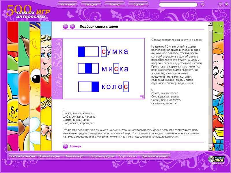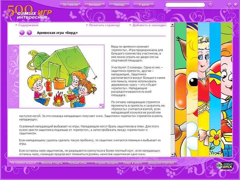 Сборник "500 самых интересных игр" поможет ответить на этот вопрос. В нем собраны игры на все случаи жизни - от развивающих до командных, от спортивных до настольных, от семейных до уличных. Вы найдете здесь даже фокусы и логические головоломки. Это диск для умных родителей - играйте вместе с детьми!