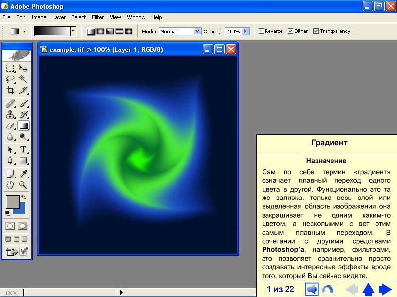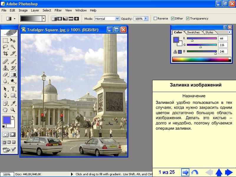 Работая с программой, ученик незаметно для себя осваивает приемы редактирования изображений. Это не отстраненное и пассивное восприятие информации, а погружение в материал с первых шагов. Учебная программа построена таким образом, что можно на конкретных примерах узнавать функции тех или иных инструментов, запоминать последовательность действий. Удобная система наводящих вопросов, подсказок, гиперссылок, а также доброжелательные комментарии делают процесс учебы простым и увлекательным.