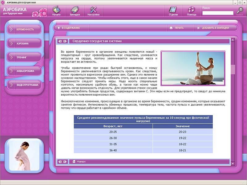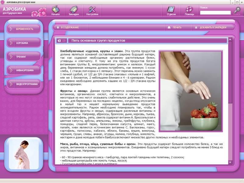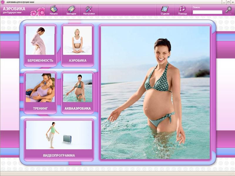 На диске содержатся 137 упражнений для занятий в зале и 34 упражнения для аквааэробики, занятия которой считаются самыми полезными для беременных. Разобраться в особенностях упражнений и выбрать наиболее подходящий курс помогут видеоролики с вариантами упражнений для разных стадий беременности.