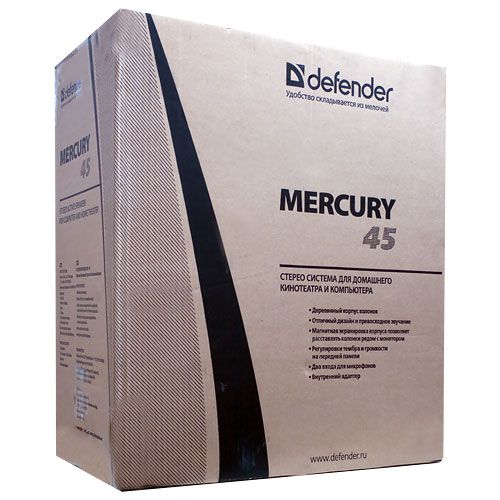 Система Defender Mercury 45 – оптимальное решение для построения домашнего кинотеатра на базе недорогого DVD-плеера. Многие пользователи сталкиваются с трудностями при использовании 5.1 систем из-за сложности в установке или небольших размеров комнат. В этом случае мы рекомендуем приобрести стереосистему 2.0 с мощным и качественным звучанием, такую как Mercury 45.