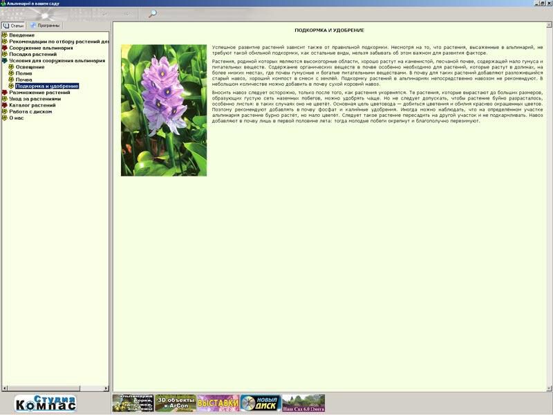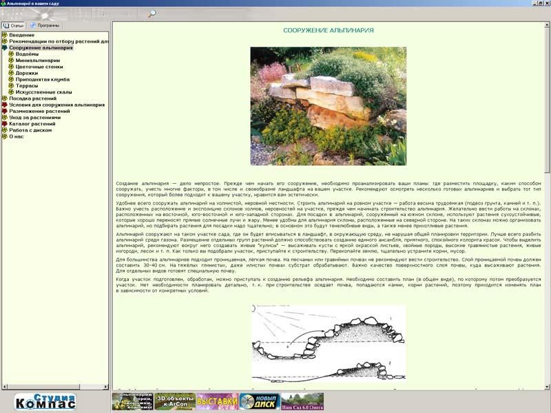 Программа поможет садоводам-любителям отлично подготовиться к дачному сезону и украсить свой сад изысканной альпийской горкой. Диск также будет полезен начинающим ландшафтным дизайнерам, желающих побольше узнать об искусстве создания альпийской горки.