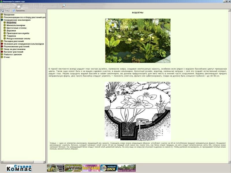 Диск расскажет вам о том, как правильно соорудить альпинарий, оформить декоративный водоем, выгодно использовать сложный рельеф участка. Вы узнаете, какими именно растениями можно оформлять альпийскую горку, как они сочетаются между собой и какой уход им требуется.