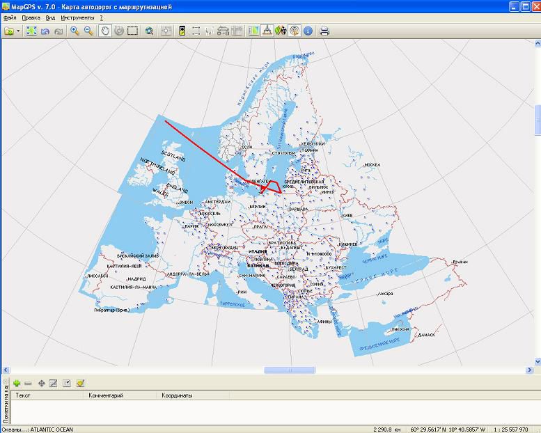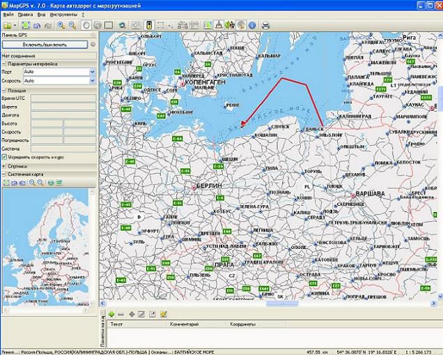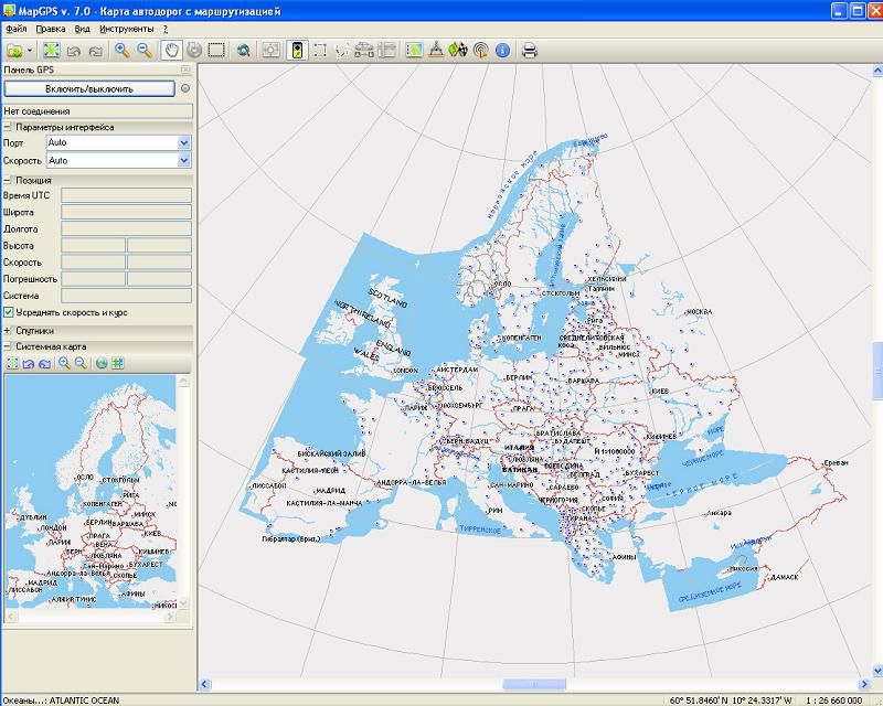 Представление картографического изображения Европы с масштабированием, сдвигами и вращением, демонстрация местоположения по данным GPS и линии прокладываемых маршрутов.