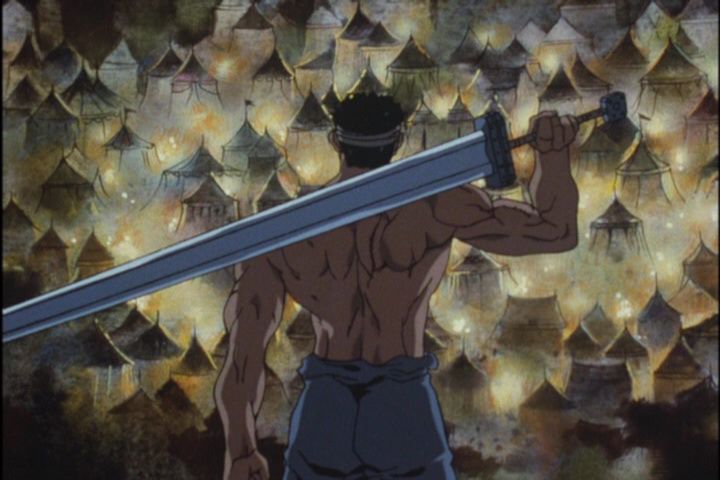Гатс бросается в реку за потерявшей сознание Каской и спасает ей жизнь, согрев своим телом - а девушка рассказывает ему, каким именно образом Гриффит заработал на содержание армии. Внезапно атакует отряд «Синих Китов», и герои разделяются — каждый берет на себя часть нападающих. Воссоединившись в лагере, Гатс и Каска узнают, что Гриффит собирает «Соколов» на выступление против человека, с которым у того давние счеты...