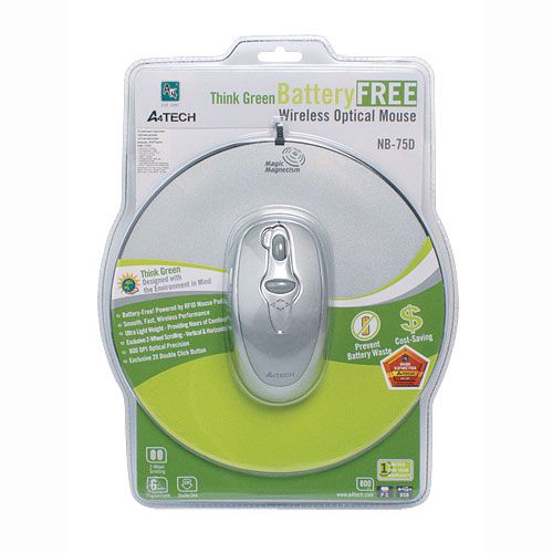 Беспроводная оптическая мышь A4Tech NB-75D работает без батарей! Отсутствие батареек в мышке делает ее легкой и проворной, а отсутствие проводов – абсолютно свободной. Мышь питается от ковра, и провод требуется самому коврику для передачи сигналов компьютеру. Коврик не пропускает воду и не нагревается после долгой работы мыши.