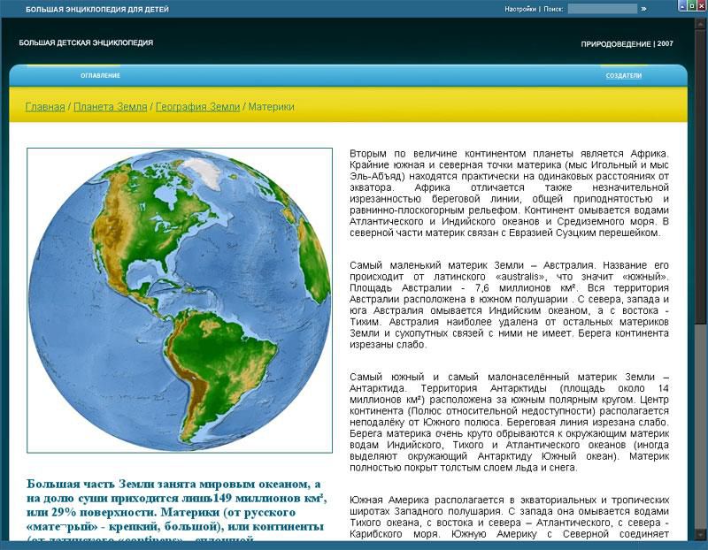 Раздел «Планета Земля» рассказывает о живой и неживой природе: из чего состоит планета Земля, кто обитает на суше, в воде и в воздухе, сколько морей и материков на Земле, знакомит с основными понятиями естествознания: географические координаты, климатические пояса и рельеф Земли, литосфера, гидросфера, атмосфера, биосфера. Читатель узнает о природе землетрясений, наводнений, ураганов, молний. Что такое радуга и полярное сияние? Что такое влажность воздуха и атмосферное давление? Что такое горение и гниение? На эти вопросы школьник найдет доступные и понятные ответы. Кроме этого, раздел содержит множество сведений о полезных ископаемых, животных и растениях.
