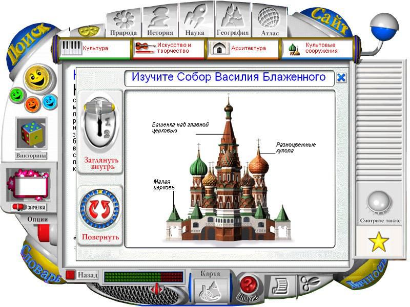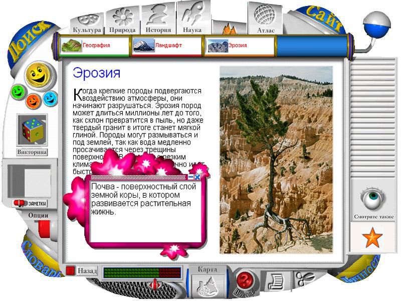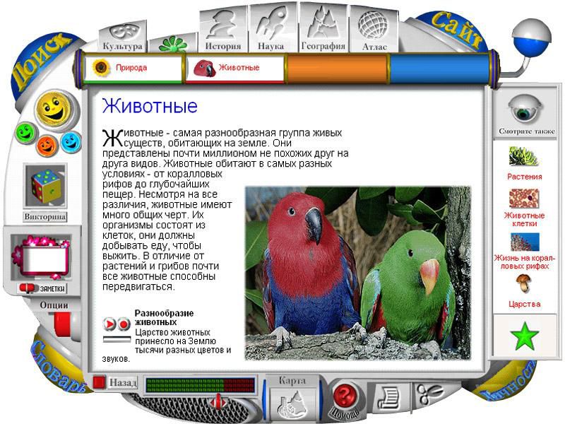 Куда бы ни отправился юный путешественник, весь мир будет стремиться рассказать ему о себе. Стоит только щелкнуть мышью предмет, растение или животное, как появляется наводящий вопрос, ответ на который ребенок сможет получить тут же, перейдя по ссылке в соответствующий раздел энциклопедии.