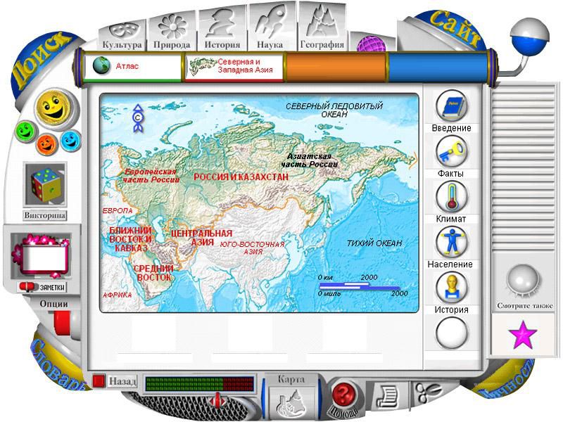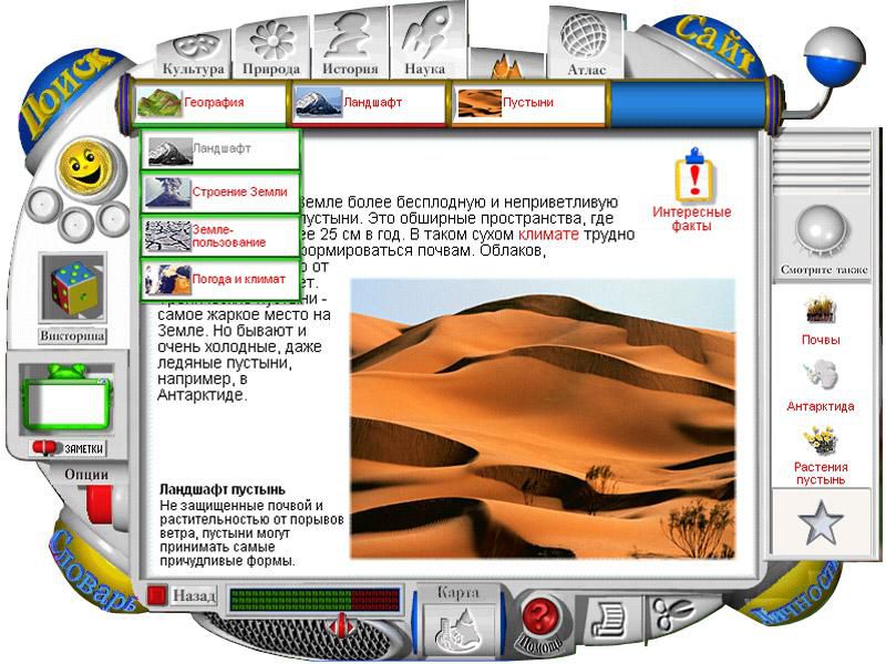 У ребенка есть выбор – воспользоваться строгой системой рубрик или же отправиться в свободное путешествие по виртуальному миру знаний. Юный исследователь сможет очутиться в джунглях, саванне или хвойном лесу, подняться в горы или опуститься на дно океана и исследовать затонувший корабль. Ему ничего не стоит из центра огромного мегаполиса перенестись в пригород на ярмарку, поселиться в деревенском доме и исследовать окрестные леса – и снова пуститься в путь!