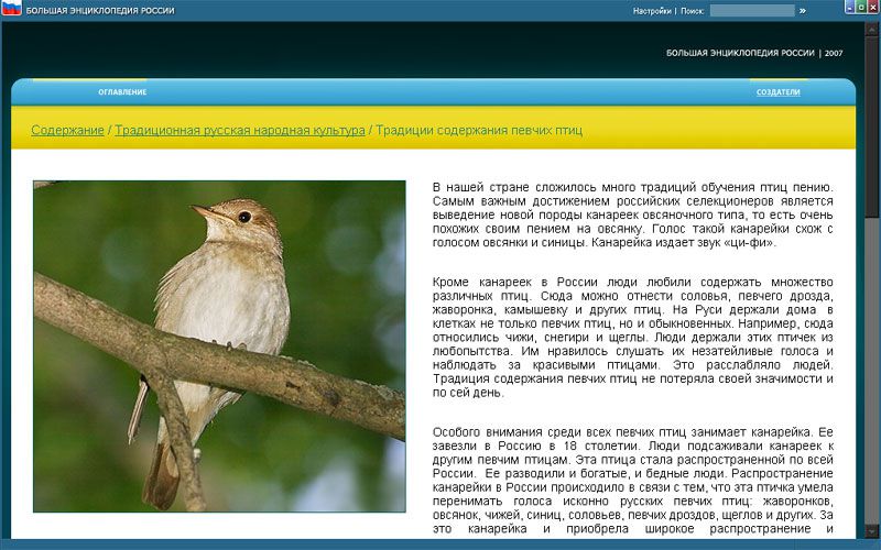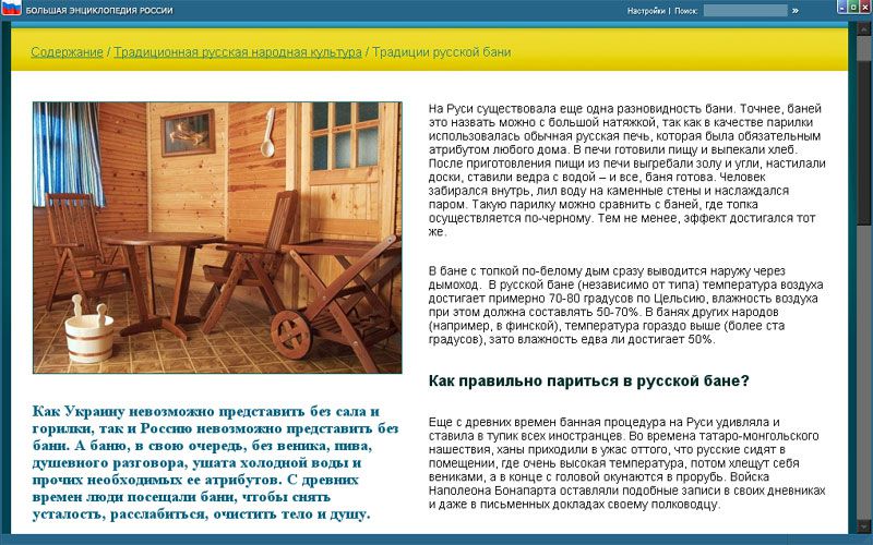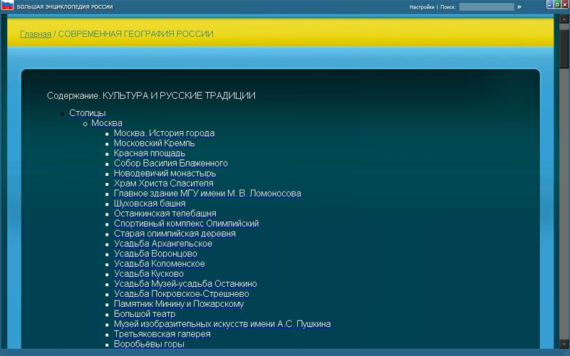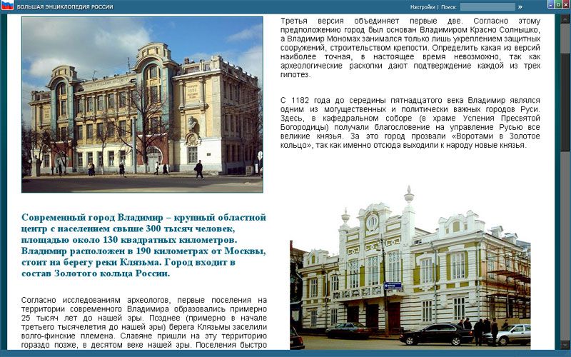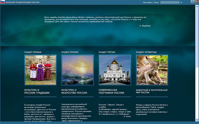 В ваших руках уникальный диск «Большая энциклопедия России». Энциклопедия содержит большой объем информации культурологического и естественно-научного порядка и представляет Россию с разных сторон.