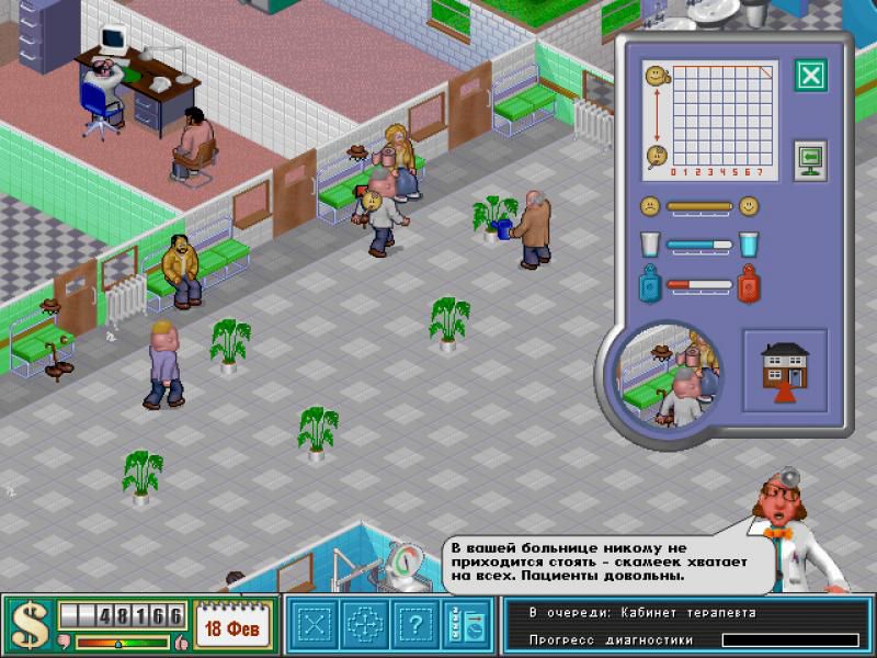 - «Живые» персонажи. У каждого из персонажей игры имеется собственный характер и постоянно меняющееся настроение, и действует он в полном соответствии с ними. Так, уставший врач может потребовать прибавки к жалованью, ленивый уборщик — забросить работу, а сидящий в очереди без воды и еды пациент — просто уйти, хлопнув дверью.