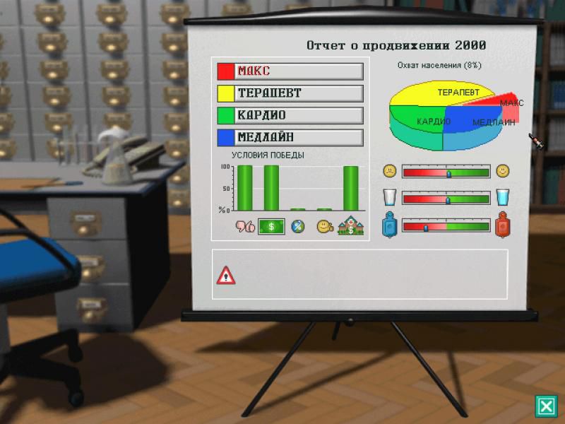 - Коллективная игра по модему и локальной сети. Конкурирующие клиники располагаются в одном городе, и только от вас зависит, куда направят свои стопы пациенты с толстыми кошельками. Внимание: при желании вы можете переманивать медперсонал у соперников!