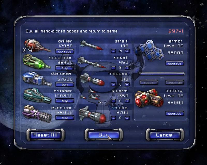 - 5 типов лазерных пушек, 5 видов ракет, 11 полезных бонусов.