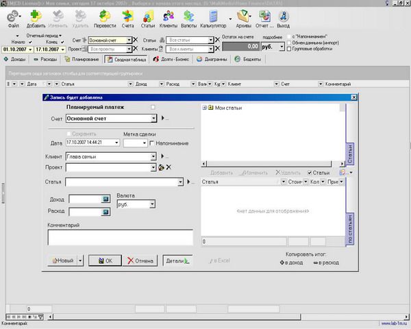 Программа позволит вам управлять домашней бухгалтерией или личными финансами, всегда быть в курсе, увидеть слабые места семейного или личного бюджета, организовать оптимальное движение средств, почувствовать уверенность и свободу. Домашние финансы» сочетают надежность, простоту и чрезвычайную гибкость при организации движения средств.