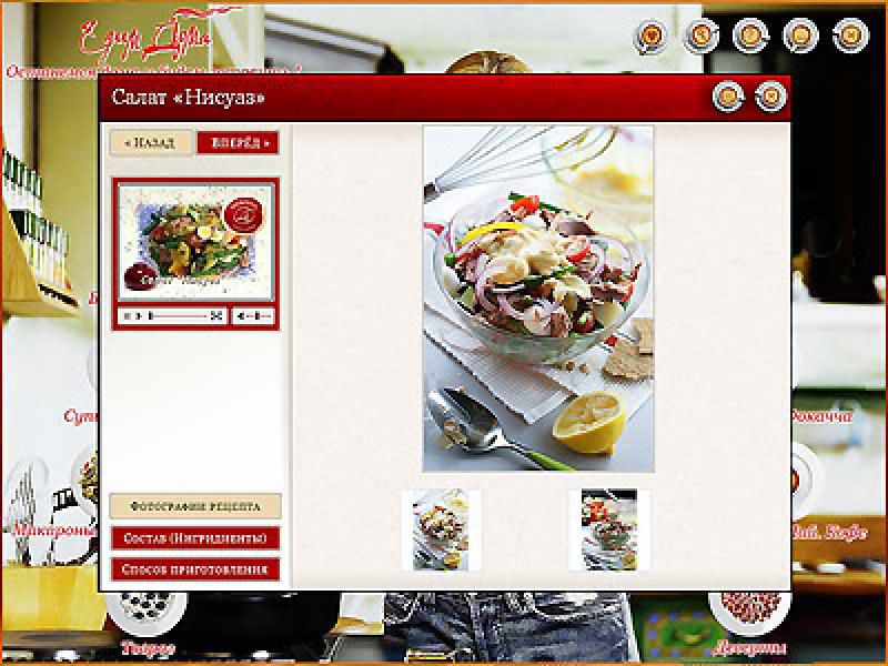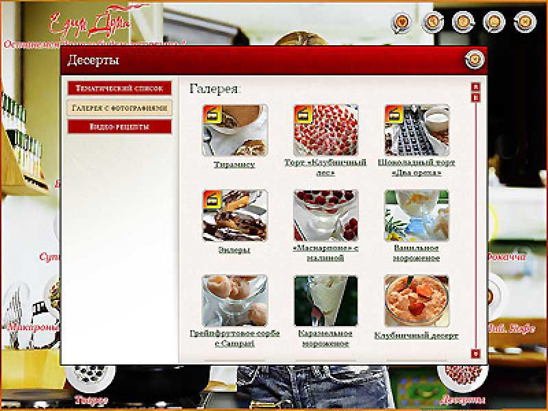 На этом диске представлено более 100 оригинальных рецептов основных блюд, напитков и десертов, 26 видеоинструкций приготовления самых вкусных и популярных лакомств, маленькие кулинарные секреты о том, как готовить вкусно, быстро и красиво.