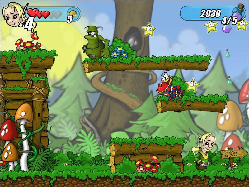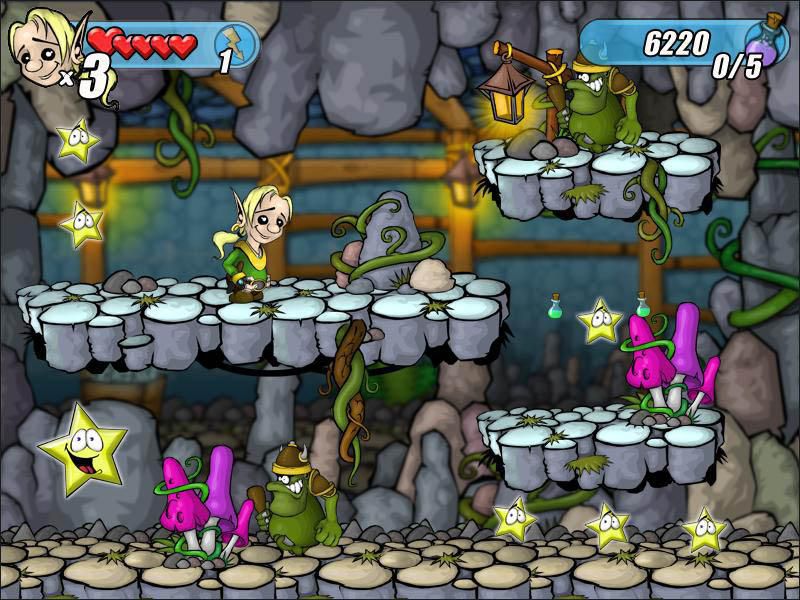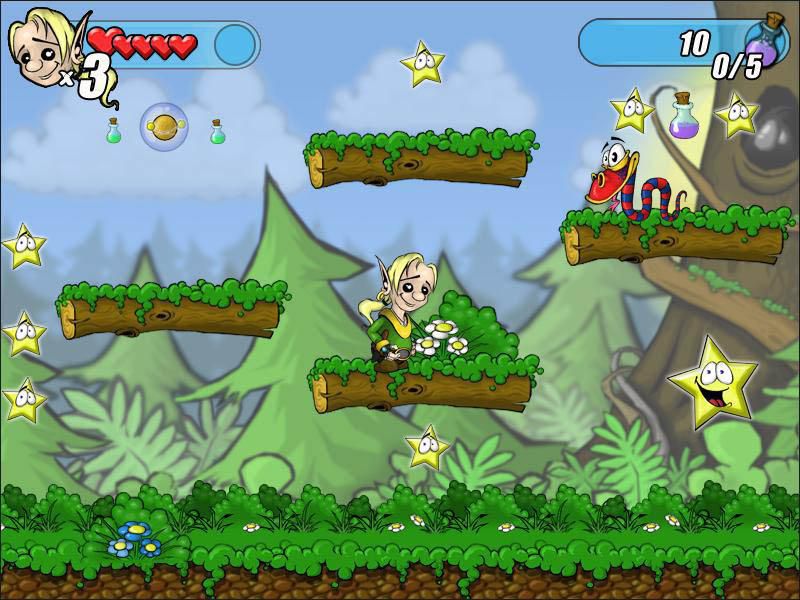 Смешной Эльф лихо прыгает по кочкам, преодолевает препятствия, ловко ускользает от кусачих змеек и хмурых гоблинов. У него – полные карманы ярких звезд и разноцветных пузырьков. А еще он умеет колдовать! В его магическом арсенале звездные шары и взрывные молнии, а также суперщит, который защитит от любых напастей. Проведи Эльфа по волшебному лесу и древним пещерам, найди все бутылочки с волшебным зельем – это будет весело!