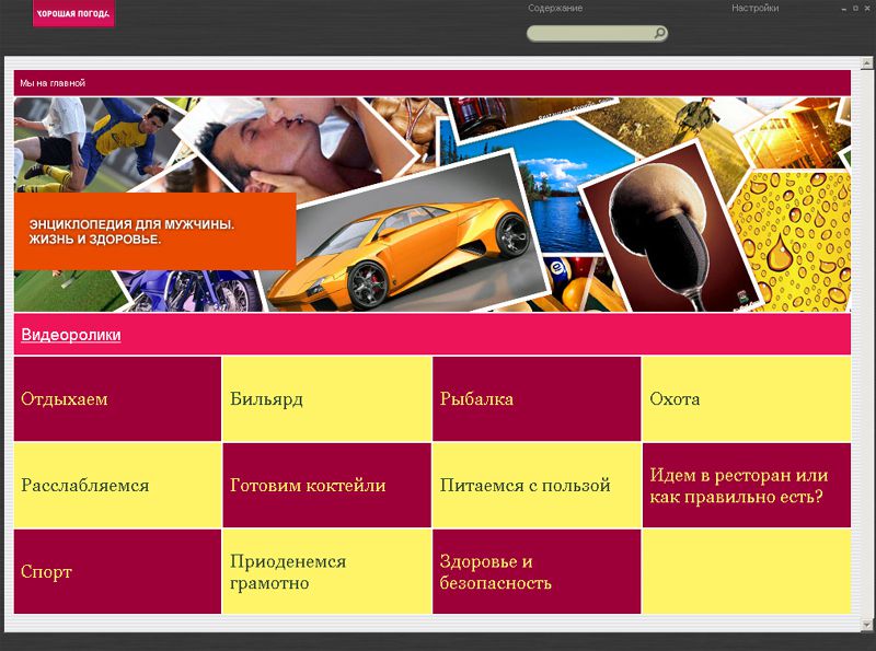 Энциклопедия для мужчины «Жизнь и здоровье» создана специально для современных мужчин, которые любят как поработать, так и отдохнуть. На диске мужчина обнаружит статьи развлекательного и энциклопедического характера, в которых освещаются разные стороны мужской жизни. В разделе «Отдыхаем» пользователь почерпнет массу полезной информации, которая касается боулинга, дартса, стритрейсинга, дайвинга, горного велосипеда и других видов активного отдыха. Отдельные разделы посвящены игре в бильярд, рыбалке и охоте. Читатель узнает, как правильно расслабиться в бане, посетить солярий, как выбирать спиртные напитки и готовить коктейли.