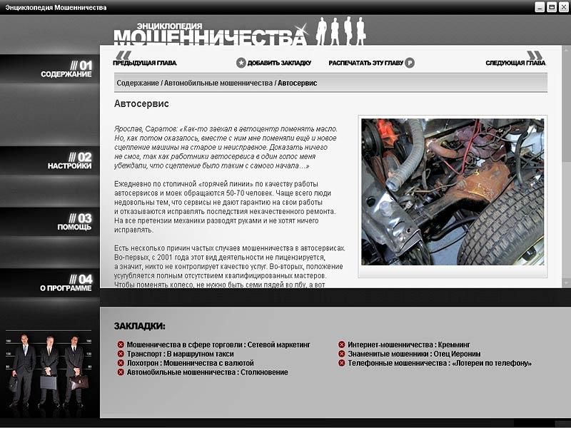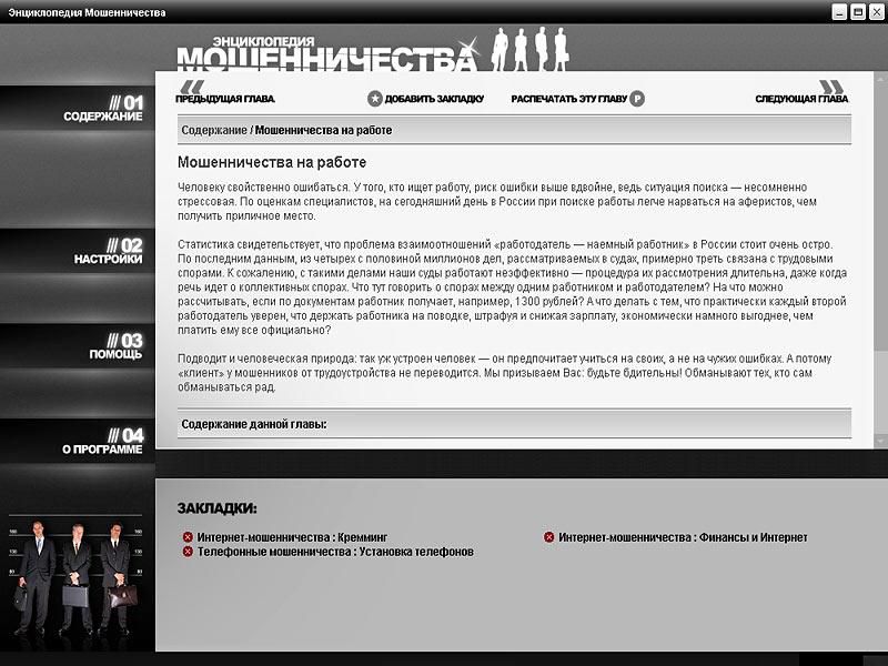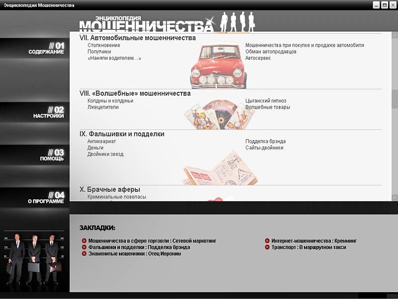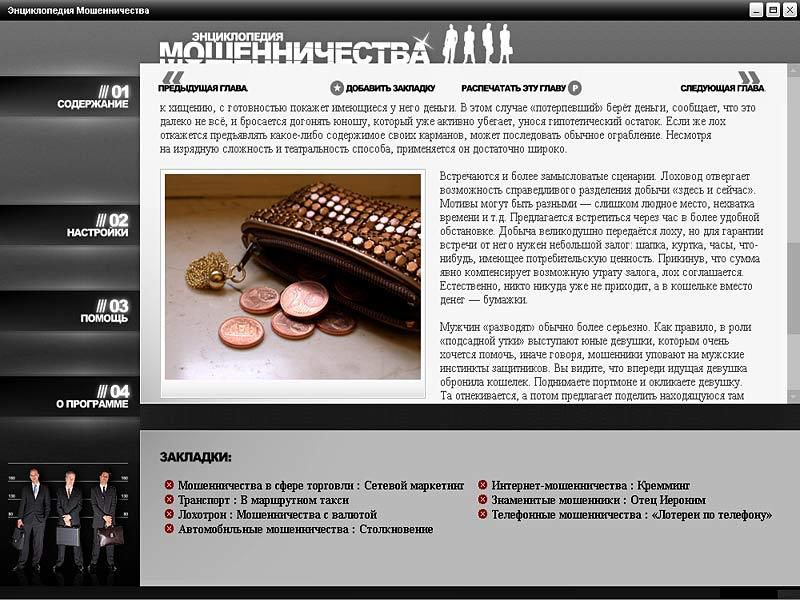 Материалы этого диска расскажут вам о типах мошенников и о том, как можно противостоять им. Здесь описаны более 150 видов обмана в различных сферах деятельности – как «классических», так и современных, таких как мошенничество в Интернете или в страховой сфере. Кроме того, вы узнаете об отчаянных, но порой невероятно блистательных аферах, получивших мировую известность. Эти рассказы о «подвигах» непревзойденных обманщиков читаются как захватывающие художественные произведения.