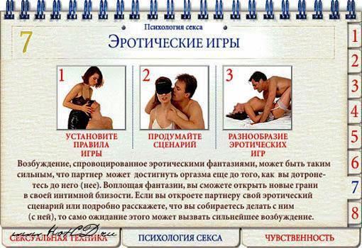 Одни разделы посвящены психологии секса, другие - овладению сексуальной техникой, третьи же призваны вдохновить на получение большего удовольствия.