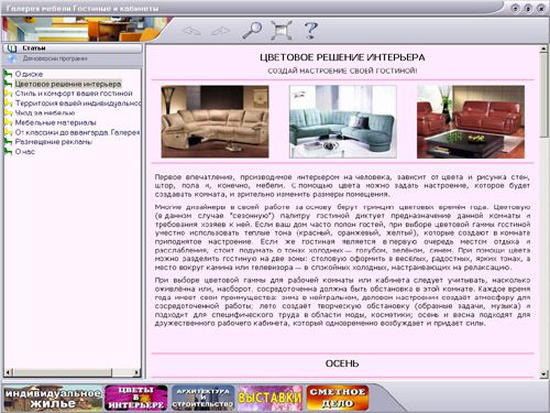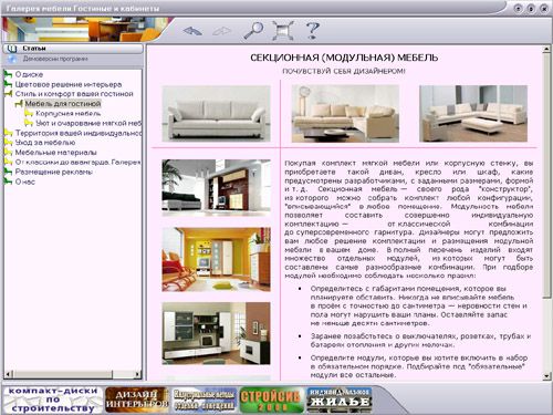 На диске содержатся рекомендации по подбору и размещению мебели в таких важных зонах вашего дома, как гостиная и рабочий кабинет. Рассмотрены характеристики (преимущества и недостатки) основных видов обивочных тканей, кожи, древесины. Предложены советы по уходу за мягкой и корпусной мебелью.
