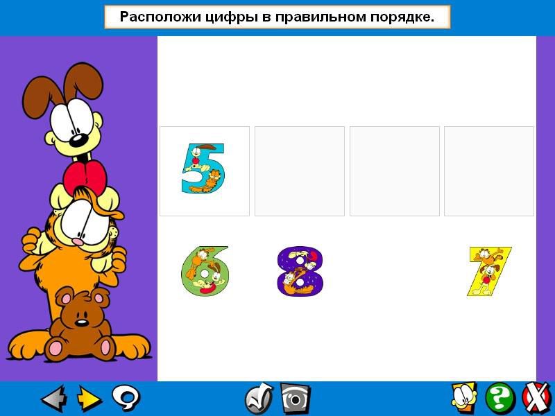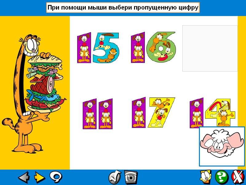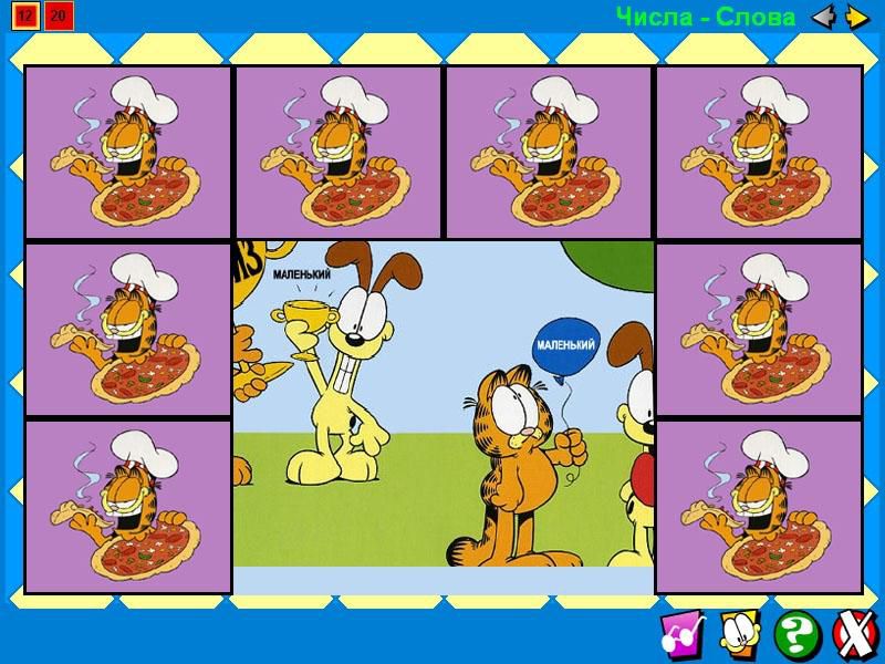 Вместе с неунывающим Гарфилдом Ваш ребенок узнает все о числах, научится сравнивать их, познакомится с группами чисел и основами порядкового счета.