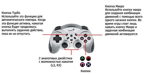 Функция «Турбо», используемая для автоматического повтора команды, обеспечивает превосходный контроль. Нажатая кнопка позволяет выполнять заданное действие, пока ее не отпустить. Она незаменима особенно в таких играх, как "бой", "драка" и "стрельба". А с помощью функции «макро» можно установить последовательность движений - для активации заданной комбинации движений достаточно нажать кнопку «Макро».