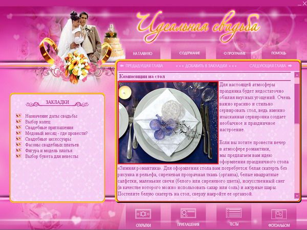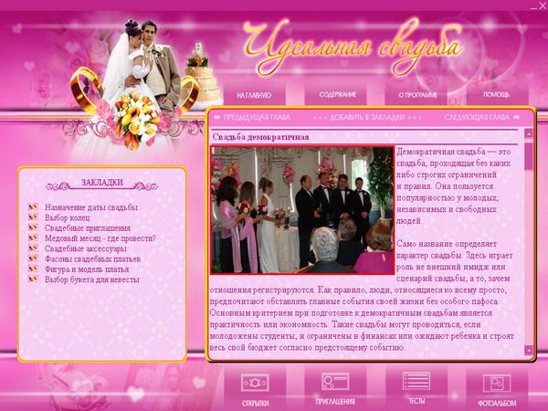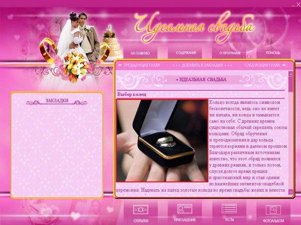 Чтобы ваш праздник не омрачался ненужными бытовыми проблемами и прошел именно так, как вы хотите, была разработана мультимедийная энциклопедия «Идеальная свадьба».