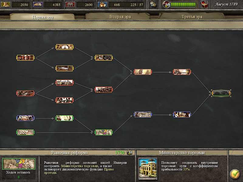 - 70 потенциально доступных открытий в различных областях: милитаризация, политика/дипломатия, ресурсы, коммерция