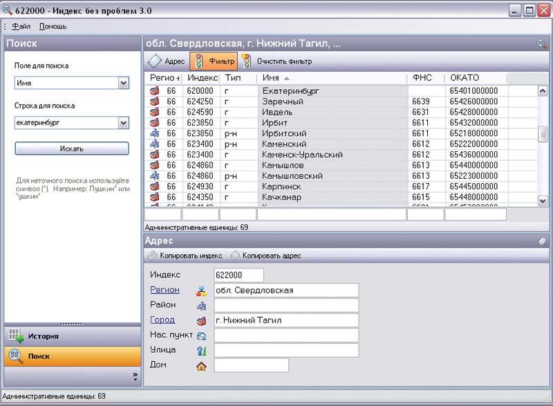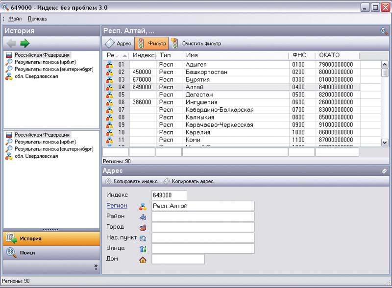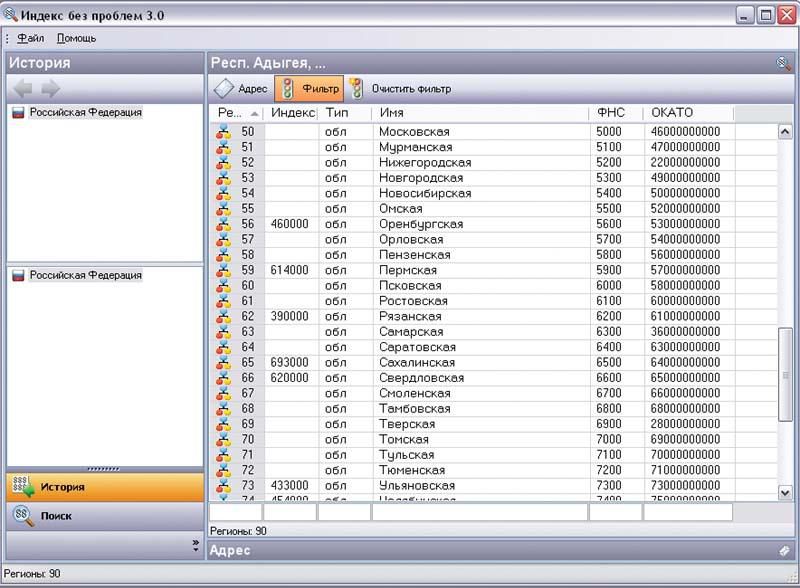 Диск содержит полную базу данных об индексах всех 89 регионов России. Удобная система поиска позволяет за считанные секунды найти не только индекс, но также код МНС и код ОКАТО по известному адресу. Информация систематизирована по принципу «от общего к частному» — от республики, края или автономной области, названия города или поселка до улицы и номера дома.