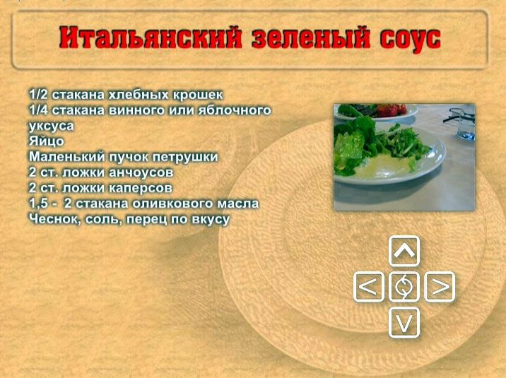 Каждый рецепт с приведенным переченем необходимых продуктов Вам будет объяснен голосом, написан на экране текстом и показан фотографией готового блюда.