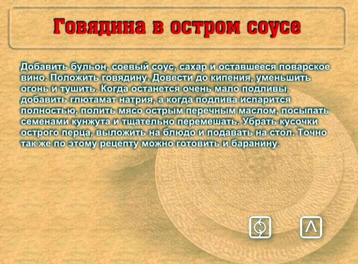 Каждый рецепт с приведенным переченем необходимых продуктов Вам будет объяснен голосом, написан на экране текстом и показан фотографией готового блюда.