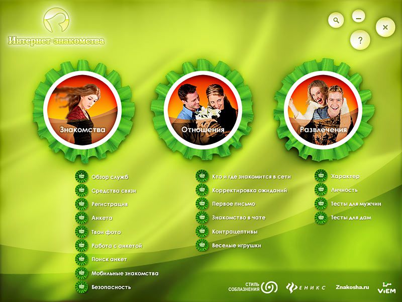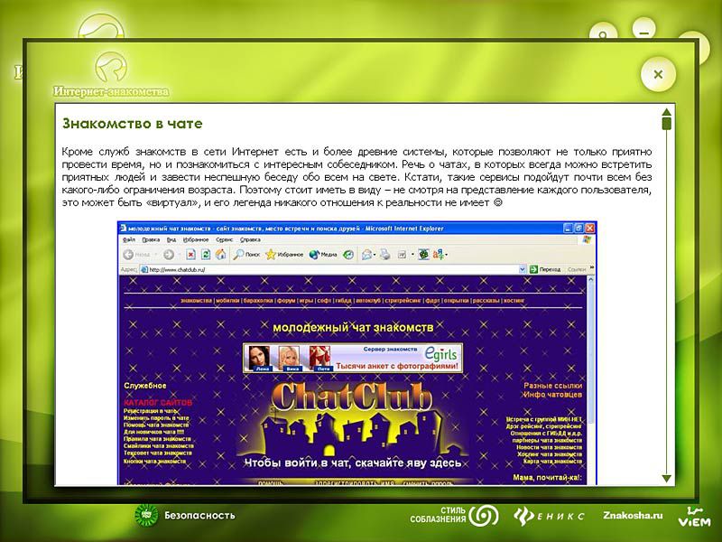 Сориентироваться в «географии» мировой Сети, познакомиться с системой и правилами виртуального общения поможет мультимедийное издание «Интернет-знакомства». Здесь представлен подробный обзор служб знакомств, форумов, конференций, ICQ, IRC, чатов, виртуальных клубов, онлайн-игр, а также обзор аналогичных возможностей, предоставляемых службами мобильной связи. Изучив представленные здесь материалы, любой пользователь сможет чувствовать себя в виртуальном мире свободно и уверенно, расширяя горизонты общения в любых направлениях.
