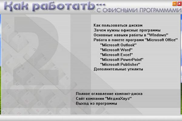 Диск "Как работать ...с офисными программами" успешно реализуется компанией "МедиаХауз" вот уже несколько лет, и за это время успел завоевать огромную популярность не только среди новичков, но и среди опытных пользователей. В общей сложности мы помогли более 70 000 человек в России и СНГ успешно освоить пакет MS Windows®.