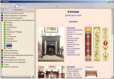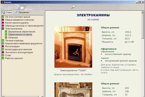 В программе-каталоге "Камины" компании "СофтКомпас" собрана самая актуальная информация о дизайне, строительстве, установке и эксплуатации каминов. Каталог моделей и аксессуаров, а также фотогалерея с работами лучших печников мира поможет разобраться в многообразии современной каминной продукции, а обзор рынка домашних очагов - сделать правильный выбор. К услугам всех желающих установить дома камин - предложения самых известных европейских фирм: Arkiane, Focus, La Romaine, Arriaga, AustroFlamm, Boley, Piazzetta, Stovax и многих других. Кроме того, специально для любителей строить своими руками предлагается каталог несложных моделей с подробными описаниями и чертежами.