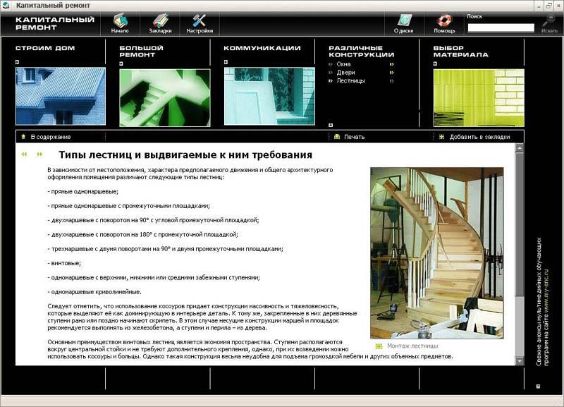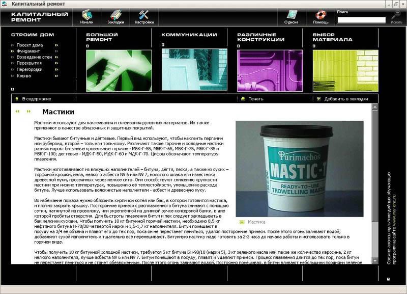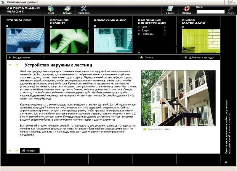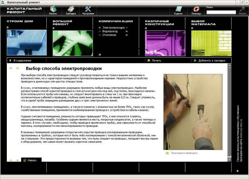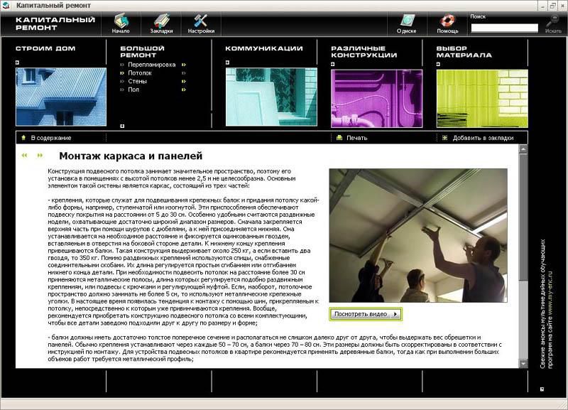 Программа поможет освоить навыки ремонтных работ даже тем, кому впервые предстоит это сложное, но увлекательное занятие. Если же вы планируете предоставить выполнение всех работ профессионалам, то материалы, собранные на диске, обеспечат вас необходимыми знаниями для ведения переговоров и руководства процессом ремонта.