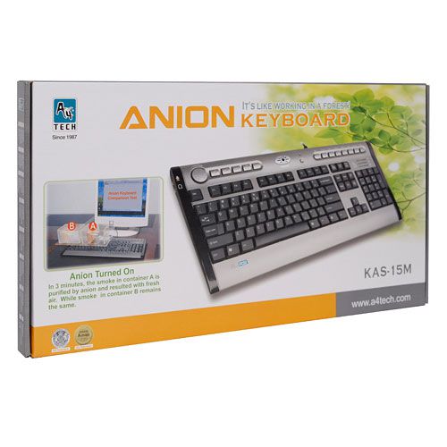 | Слим-клавиатура A4Tech KA(S)-15 с ионизатором воздуха (маленькое отверстие в центре клавиатуры) позволяет обогатить воздух специальными анионами, если клавиатура подключена к компьютеру. Инновационная технология ионизации воздуха позволяет очищать воздух, абсорбировать никотиновую пыль, снижает уровень вирусов и болезнетворных микробов в воздухе.