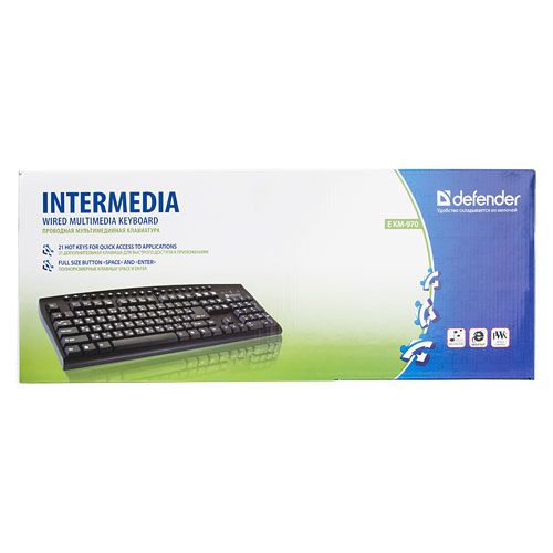 Компактная мультимедийная клавиатура Defender Intermedia имеет стандартную раскладку клавиш, полноразмерные клавиши Space (пробел) и Enter, а также 21 горячую клавишу  для управления средствами мультимедиа. Лазерное нанесение букв и символов на клавишах гарантирует их долговечность и износостойкость. Для максимального удобства клавиатура имеет регулируемый угол наклона.