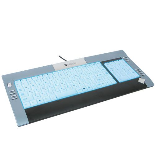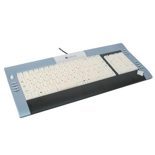 Слим-клавиатура имеет 15 «горячих» клавиш, встроенное колесо прокрутки и кнопку управления звуком/треками, сделанную в форме джойстика. Для максимально комфортной работы на клавиатуре встроена подставка под запястья. Дополнительные кнопки выполнены в слим-формате. Русская раскладка на клавиатуре красного цвета.