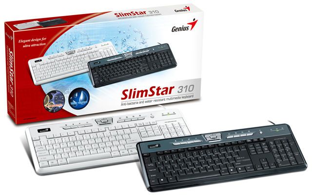 Genius SlimStar 310 - это компактная, тонкая мультимедийная клавиатура. Она отличается антибактериальными свойствами и является водонепроницаемой, что позволяет её мыть. Кроме стандартных клавиш на Genius SlimStar 310 присутствует 14 клавиш быстрого доступа к мультимедийным функциям, Интернет навигации, отправке сообщений, приложениям Office. На них гальваническим способом нанесен слой серебра, существенно снижающий количество болезнетворных микроорганизмов, со временем скапливающихся на любой клавиатуре.