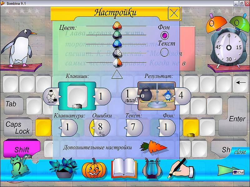 У юного пользователя есть возможность выполнять упражнения на любом тексте и самостоятельно определять допустимый процент ошибок, а в перерыве между занятиями посмотреть веселый ролик. Удобные настройки интерфейса позволяют преобразить программу по своему вкусу - выбрать тип клавиатуры, оформление, фоновую музыку.