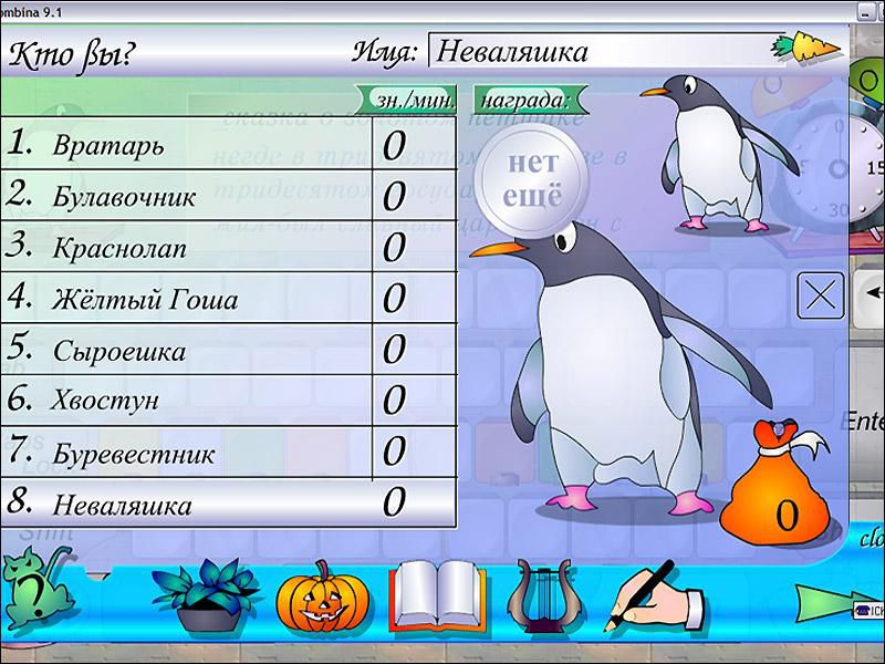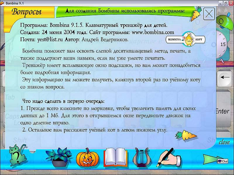 Высокая скорость набора текстов - важное умение, которое пригодится каждому современному школьнику. Свободное владение клавиатурой сделает личную переписку и работу над школьными заданиями легкими и быстрыми. Игровой клавиатурный тренажер "Бомбина" поможет детям 8-15 лет быстро освоить десятипальцевый слепой метод набора текстов. Благодаря веселой анимации и добрым советчикам ребенок без труда выучит расположение клавиш. Электронная клавиатура подсказывает, как и куда надо ставить пальцы, а прыгающие фишки помогают набрать нужную скорость: надо только следить за ними и нажимать клавиши, не глядя на клавиатуру.