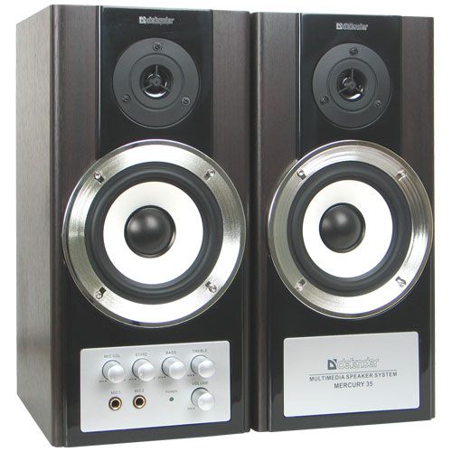 КолонкиDefender Mercury 35 выглядят очень основательно за счет не только своих немалых габаритов, но и красивой отделки полимером «под дерево». Корпуса колонок изготовлены из фибролита, крепление динамиков выполнено надежно – дребезжаний не будет. Активная акустическая система Defender Mercury 35 очень проста в установке и управлении. Регуляторы громкости, баса и тембра вынесены на переднюю панель, что делает настройку очень удобной. Такое расположение регуляторов отлично вписывается в общий дизайн акустической системы.