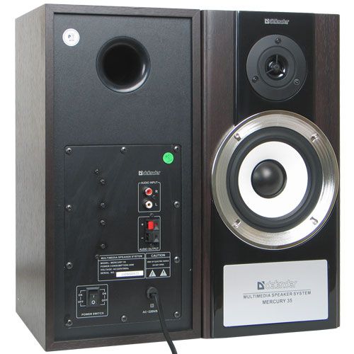 Колонки Defender Mercury 35 выглядят очень основательно за счет не только своих немалых габаритов, но и красивой отделки полимером «под дерево». Корпуса колонок изготовлены из фибролита, крепление динамиков выполнено надежно – дребезжаний не будет. Активная акустическая система Defender Mercury 35 очень проста в установке и управлении. Регуляторы громкости, баса и тембра вынесены на переднюю панель, что делает настройку очень удобной. Такое расположение регуляторов отлично вписывается в общий дизайн акустической системы.