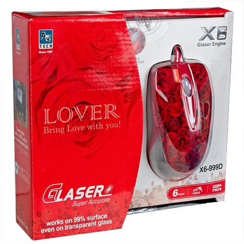 Необычайно женственная мышка для любительниц алых роз и насыщенных красок. Модель X6-999D радует глаз необычным, ярким дизайном и работает практически на любой поверхности, в том числе и на матовом стекле*. Нижняя часть корпуса мыши при работе светится синим цветом.