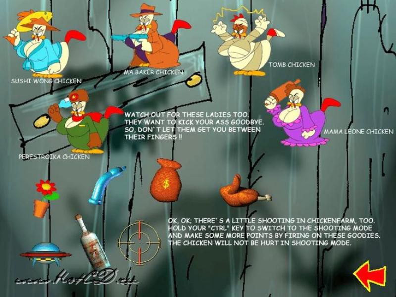Но не думайте, что все будет так просто - вас подстерегают нешуточные опасности в лице затянутых в черную кожу садомазо-куриц. Вам придется проявлять чудеса ловкости, чтобы избежать загадочных предметов, которые метают в Вас злобные куриные тетки.