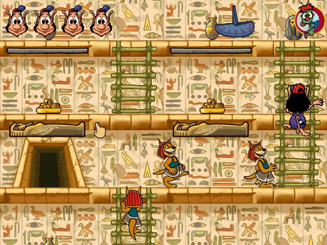 - Древний Египет - Пройдя по всем этажам древней пирамиды, Кузька должен помочь мастеру похоронных дел уложить три мумии в отведенные для них саркофаги. Но сделать это не так-то просто, ведь в коридорах пирамиды Кузька может столкнуться с разбойниками, ищущими золото и драгоценности. А кроме того, наш герой обязательно должен успеть до рассвета.