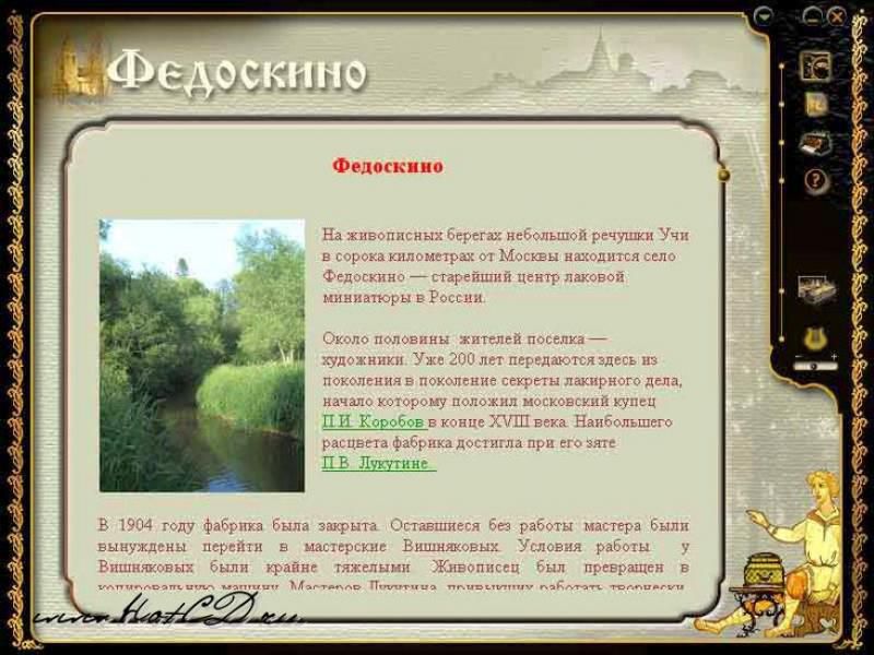 Среди суеты и блеска современной жизни рассказ о затейливых созданиях декоративного искусства – лаковой миниатюры – особенно согревает душу. Звучит тихий перелив балалайки, начинается рассказ о заповедных российских городах и селах – хранителях старинных традиций. Мастера Федосьино, Холуя, Палеха, Мстеры – всемирно известных центров производства лаковой миниатюры – и в наши дни создают настоящие шедевры.