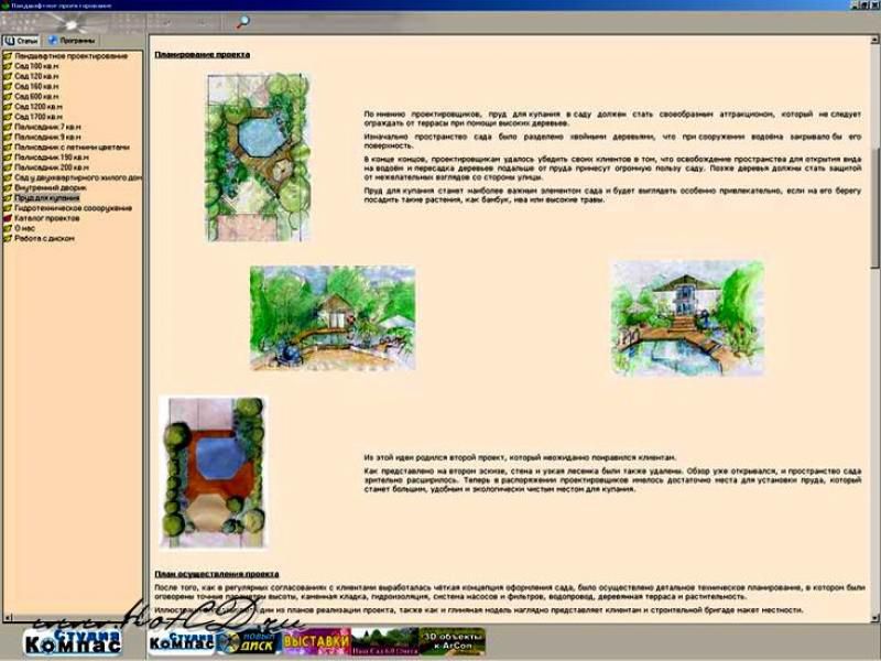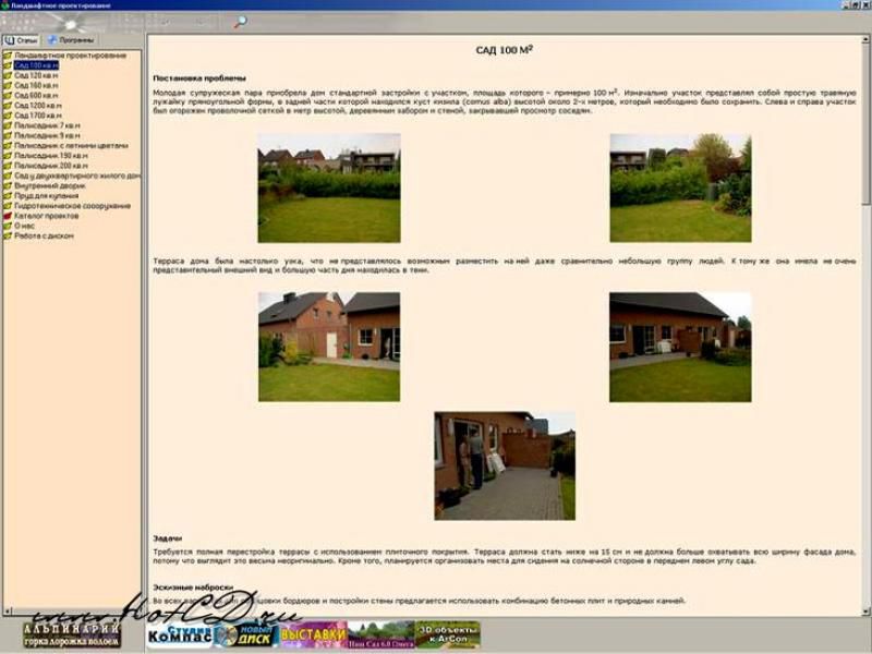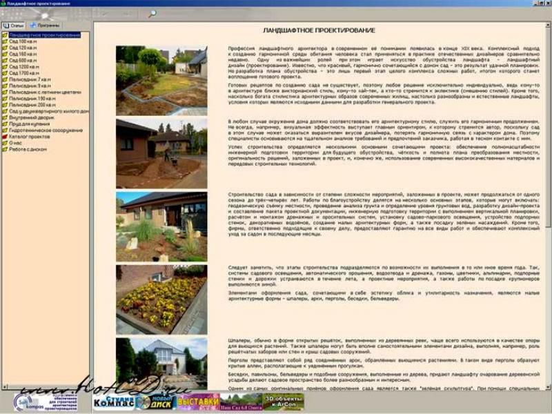 На диске представлены как типичные примеры оформления приусадебного участка, так и нестандартные модели. Профессиональные дизайнеры подготовили оригинальные решения для любого типа участков с разными естественными ландшафтами – от палисадника в 7 кв. м до многоуровневого сада площадью 1700 кв. м.